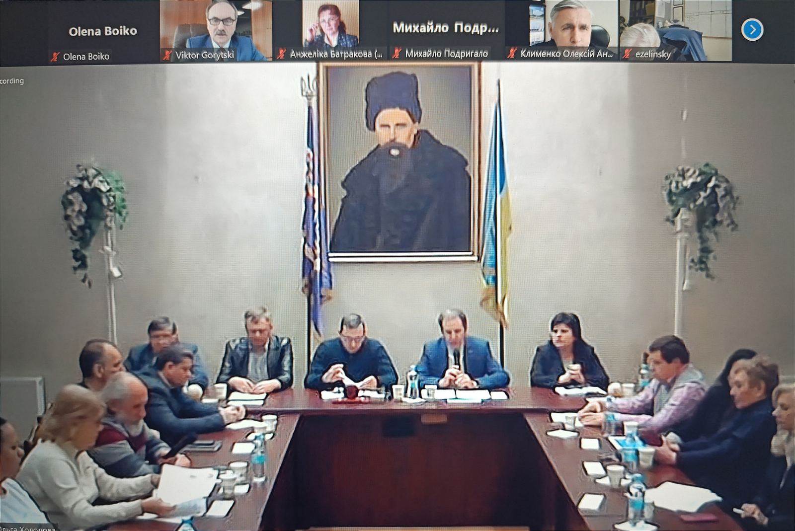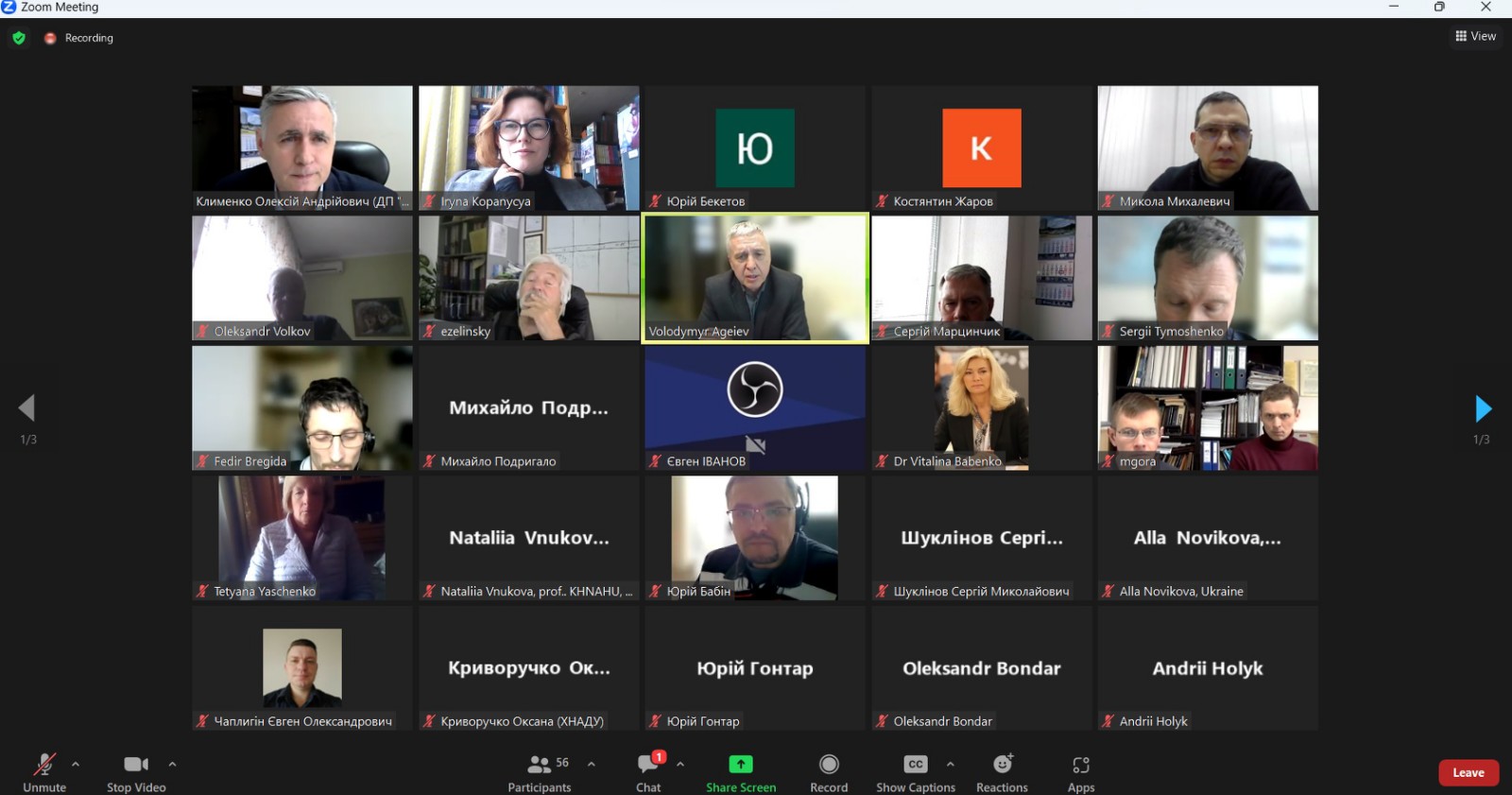 Незважаючи на складну ситуацію в місті, колектив ХНАДУ зібрався в конференційній залі університету, звідки й відбувалася трансляція заходу для партнерів із Києва. Організатори зустрічі – проректор з науково-педагогічної роботи, доцент Микола МИХАЛЕВИЧ та декан факультету транспортних систем, професор Юрій БЕКЕТОВ – надали можливість усім деканам факультетів представити провідних учених кафедр.