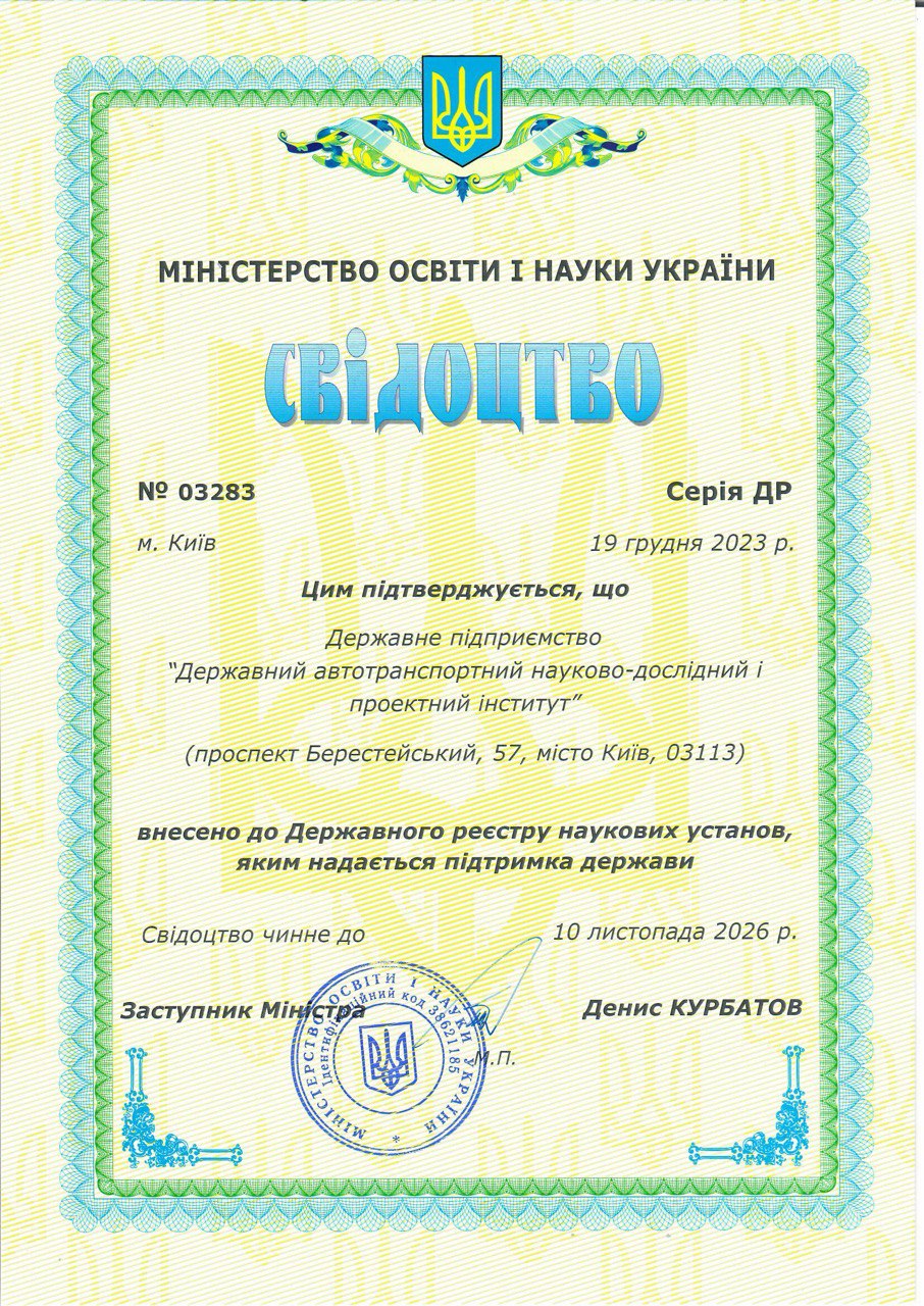 Наш Інститут вкотре включили до Державного реєстру наукових установ, яким надається підтримка держави, що підтверджується виданим Свідоцтвом, з терміном дії до 10 листопада 2026 р. (наказ МОН України № 1536 від 19.12.2023).