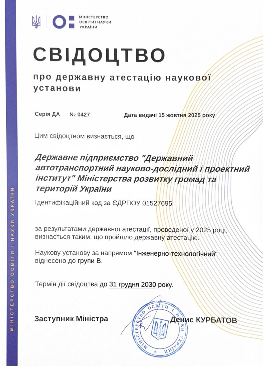 ДП “ДержавтотрансНДІпроект” отримало свідоцтво про державну атестацію наукової установи за підписом заступника Міністра освіти і науки України Дениса КУРБАТОВА. Документ вкотре підтвердив високий науковий статус нашого Інституту за напрямом “інженерно-технологічний”, група В.