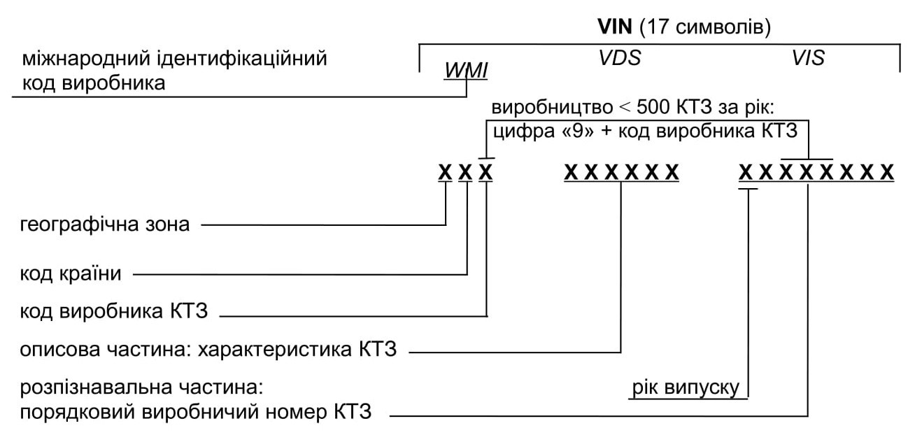 Зміст і структуру ідентифікаційного номера КТЗ (далі – VIN) визначає ДСТУ ISO 3779:2012 «Колісні транспортні засоби. Номер ідентифікаційний транспортного засобу (VIN). Зміст і структура».